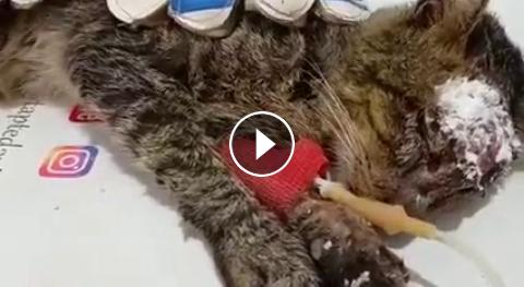 Osmaniye'de yangından kurtulduktan sonra günlerce aç ve susuz kalan kediciğin operasyondan sonraki Haytap Kliniğinde ilk günü